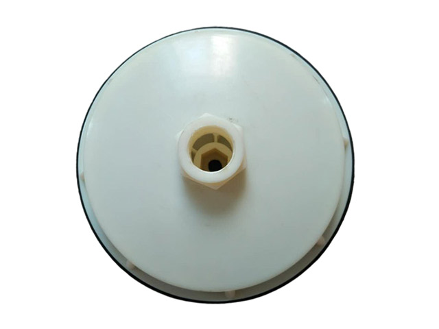 球冠形微孔曝气器主要由曝气膜片、支承托盘、螺旋压盖、螺纹接咀等部件组成。组装时,只要将橡胶膜片套在支承托盘上,用螺旋压盖拧紧即可。在安装时,再把支承托盘(中心有G3/4”内螺纹通气道)装于布气管道顶部的螺纹接咀上。球冠形微孔曝气器工作时,空气上布气管经支承托盘通气道进入曝气膜片间。在空气压力作用下,使膜片微微鼓起,孔眼张开,在水中可产生直径<3mm的微气泡。停止供气时,由于膜片和托盘之间压力渐渐下降,以及水压和膜片本身的回弹性作用,使孔眼逐渐闭合,将膜片压实于支承托盘上。